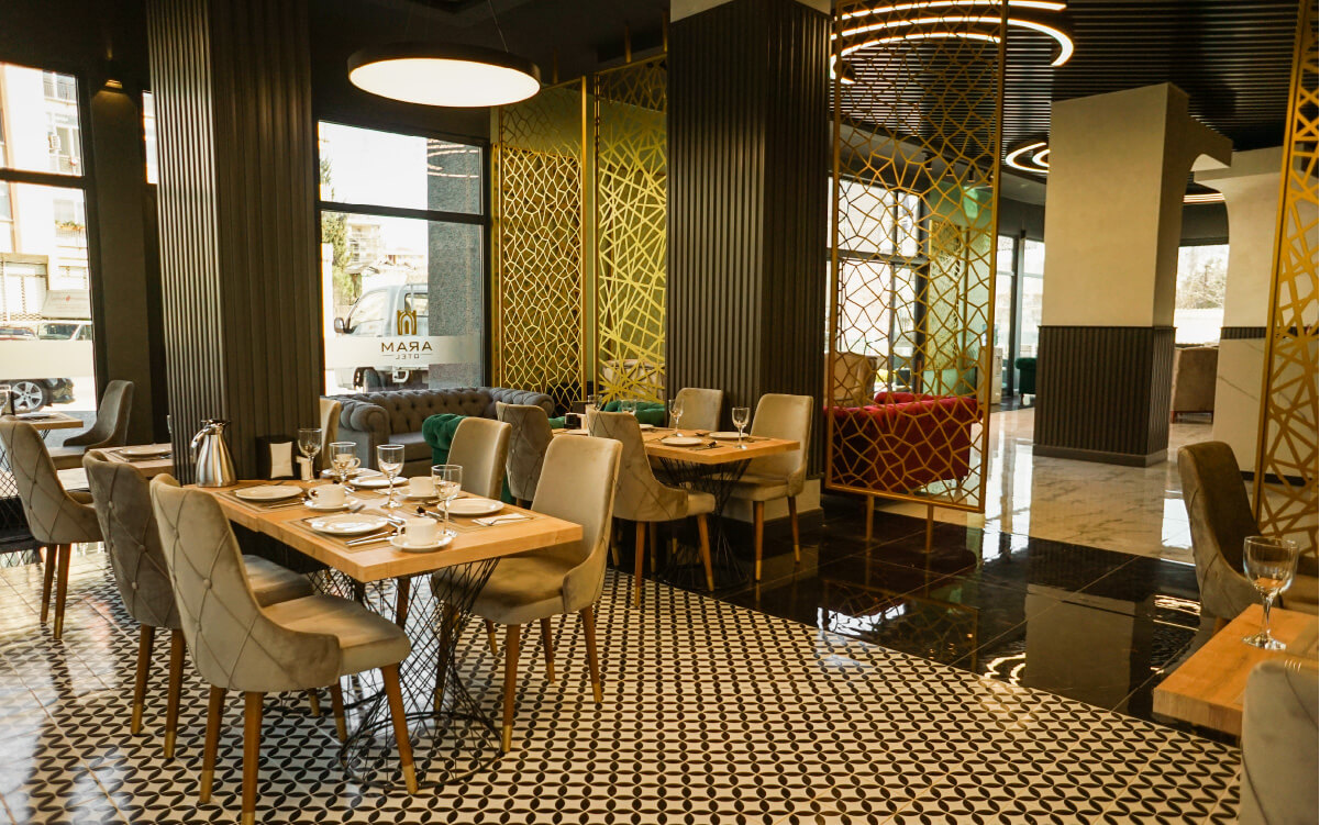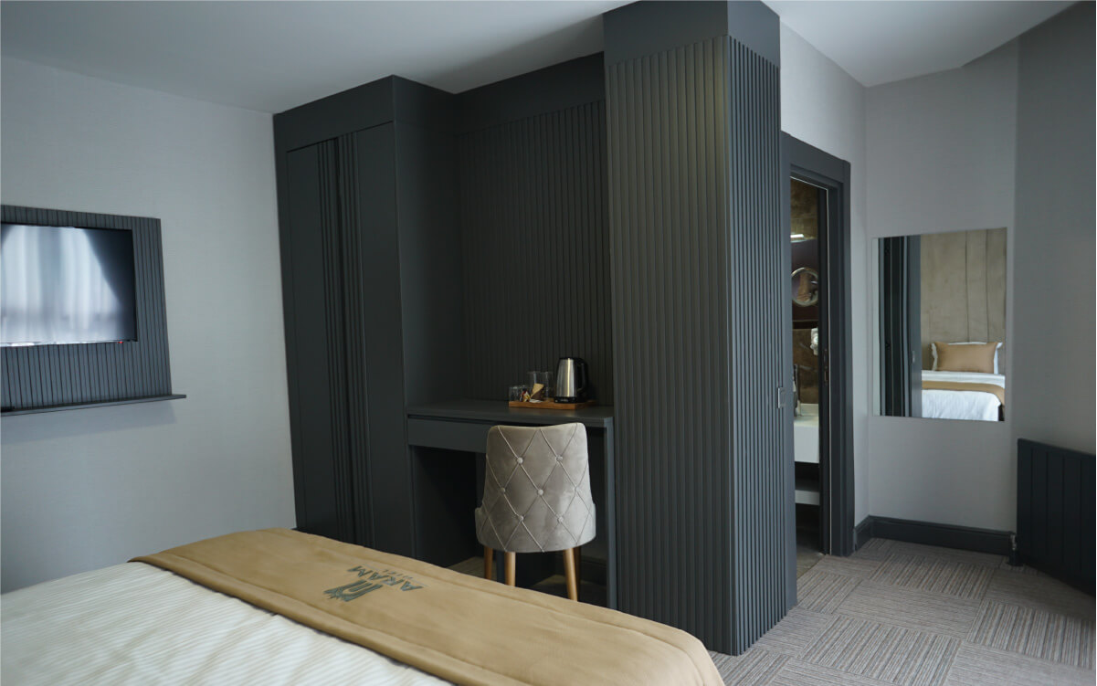 Aram hotel projesinde 40 oda, 1 adet 50 kişilik toplantı salonu, 1 ofis odası, zemin katta 100m2 restaurant alanı, 150m2 lobi alanı bulunmaktadır.